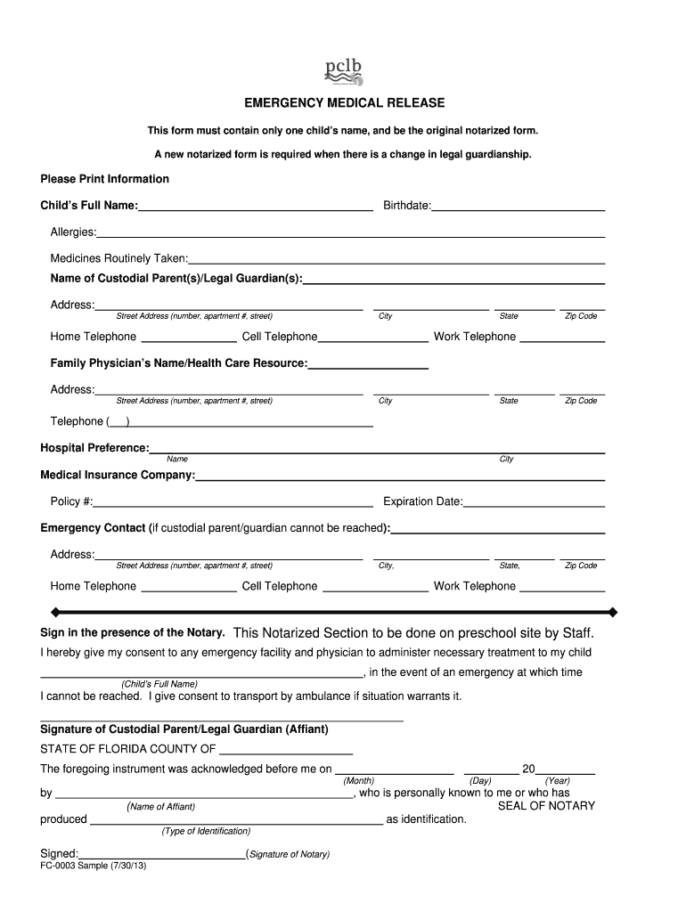 EMERGENCY MEDICAL RELEASE This form must contain only one child s name, and be the original notarized form. A new notarized form is required when there is a change in legal guardianship. Please Print