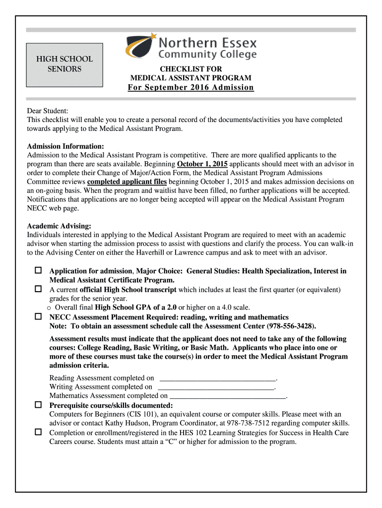 HIGH SCHOOL SENIORS CHECKLIST FOR MEDICAL ASSISTANT PROGRAM For September 2016 Admission Dear Student: This checklist will enable you to create a personal record of the documents/activities you have