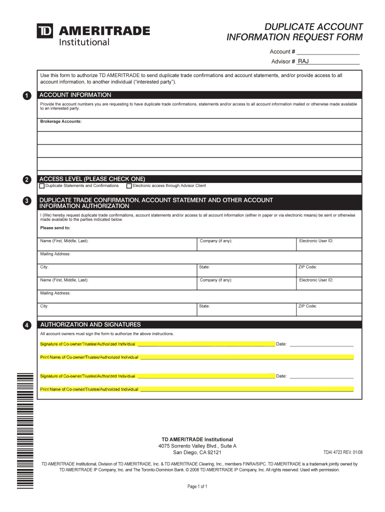 Reset Form Duplicate account information request FORM Account # RAJ Advisor # Use this form to authorize TD Ameliorates to send duplicate trade confirmations and account statements, and/or provide