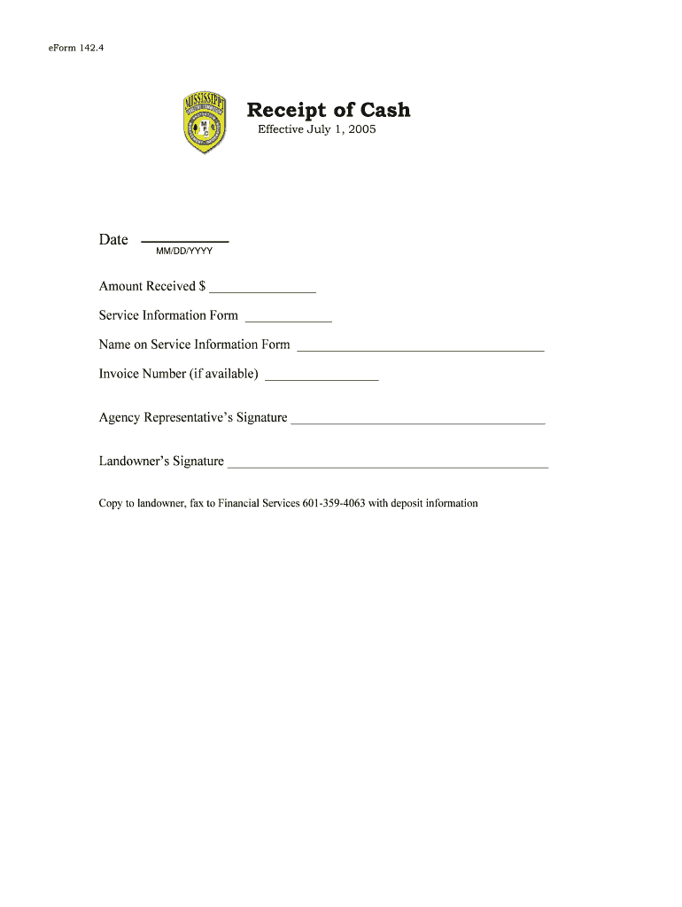 Form 142.4 Receipt of Cash Effective July 1, 2005, Date MM/DD/YYY Amount Received $ Service Information Form Name on Service Information Form Invoice Number (if available) Agency Representatives Signature