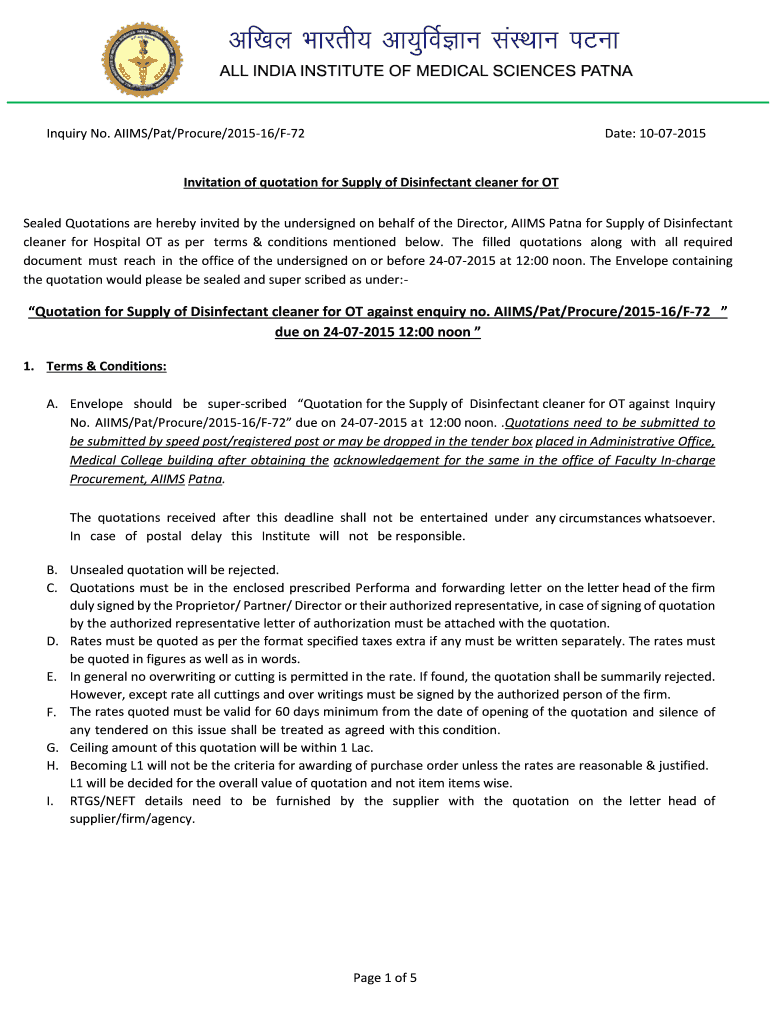 Inquiry No. AIMS/Pat/Procure/201516/F72 Date: 10072015 Invitation of quotation for Supply of Disinfectant cleaner for OT Sealed Quotations are hereby invited by the undersigned on behalf of the Director,