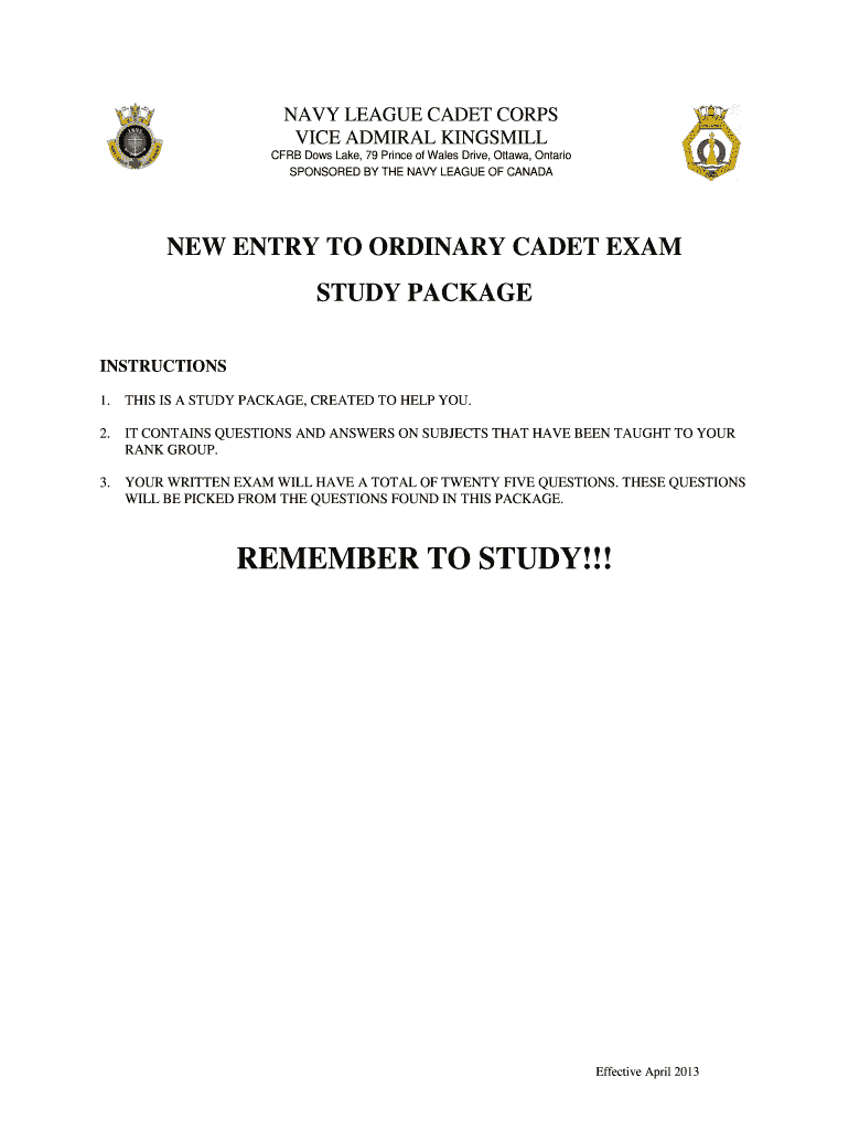 NAVY LEAGUE CADET CORPS VICE ADMIRAL KINGSHIP CURB Dow's Lake, 79 Prince of Wales Drive, Ottawa, Ontario SPONSORED BY THE NAVY LEAGUE OF CANADA NEW ENTRY TO ORDINARY CADET EXAM STUDY PACKAGE INSTRUCTIONS
