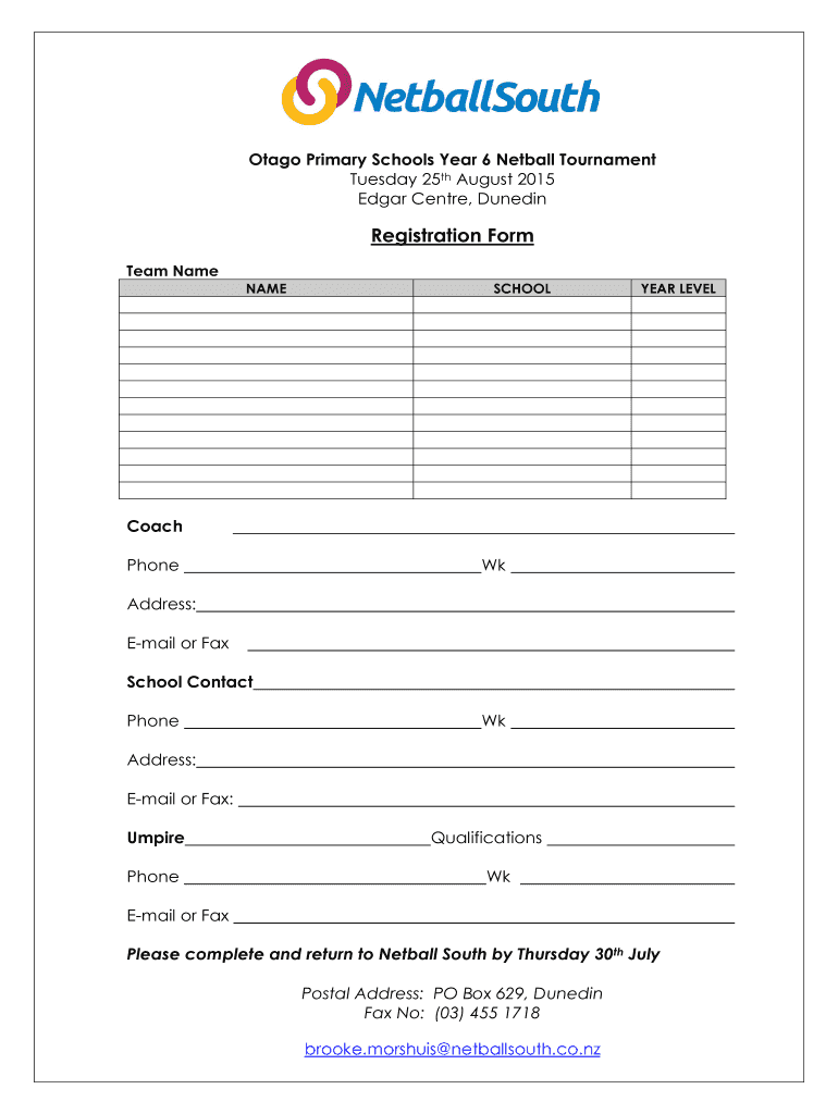 Stage Primary Schools Year 6 Netball Tournament Tuesday 25th August 2015 Edgar Center, Dunedin Registration Form Team Name SCHOOL YEAR LEVEL Coach Phone Wk Address: Email or Fax School Contact Phone