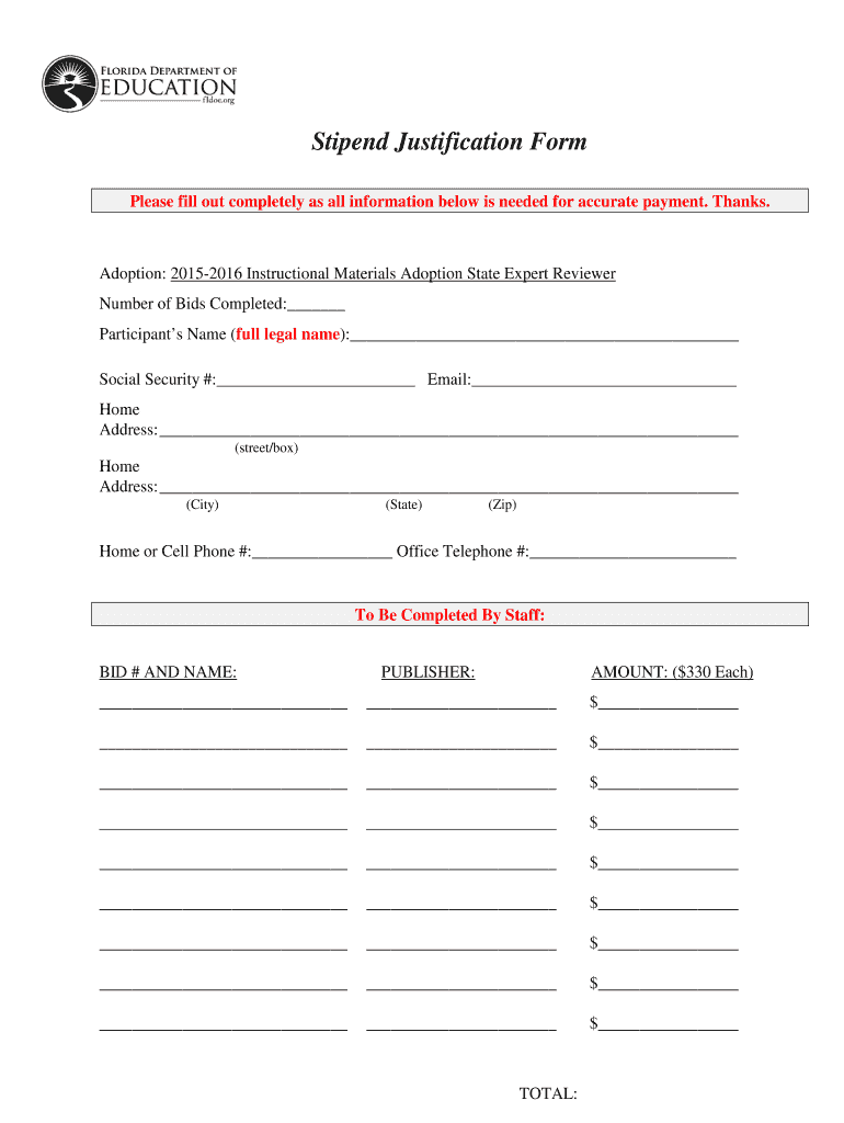 Stipend Justification Form. Please fill out completely as all information below is needed for accurate payment. Thanks. Adoption: 20152016 Instructional Materials ...