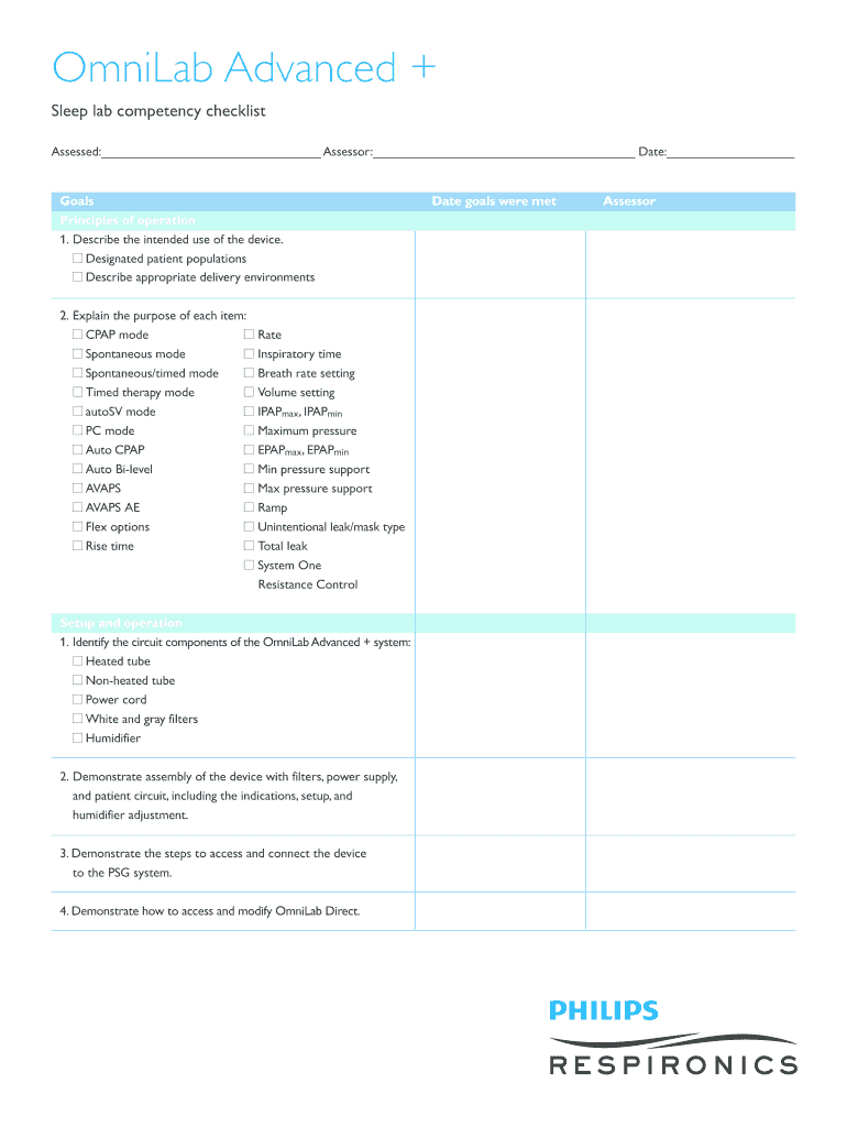 Minilab Advanced + Sleep lab competency checklist Assessed: Assessor: Date: Just the essentials Goals Principles of operation 1. Describe the intended use of the device. N Designated patient populations