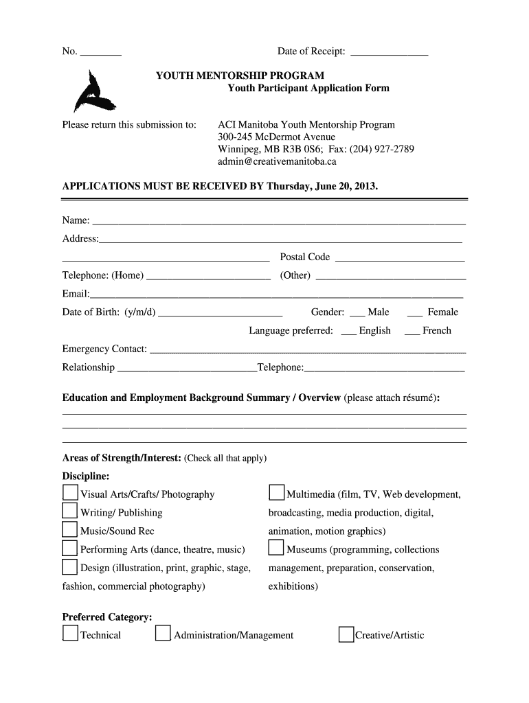No. Date of Receipt: YOUTH MENTORSHIP PROGRAM Youth Participant Application Form Please return this submission to: ACI Manitoba Youth Mentorship Program 300245 McDermott Avenue Winnipeg, MB R3B 0S6;