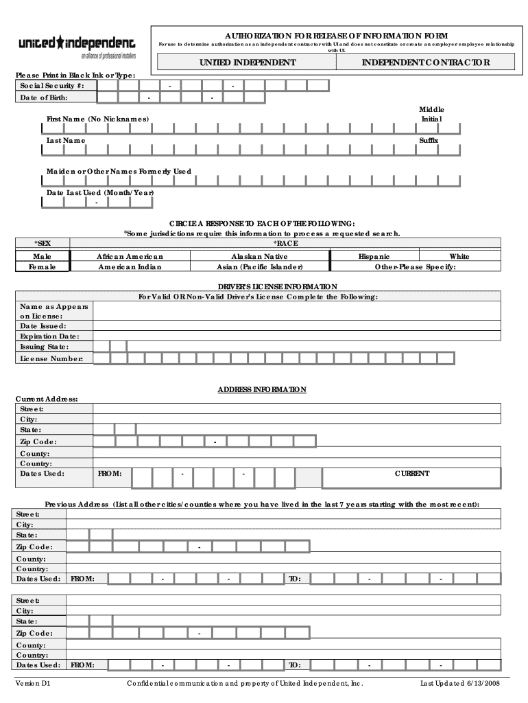 AUTHORIZATION FOR RELEASE OF INFORMATION FORM For use to determine authorization as an independent contractor with UI and does not constitute or create an employer/employee relationship with UI. UNITED