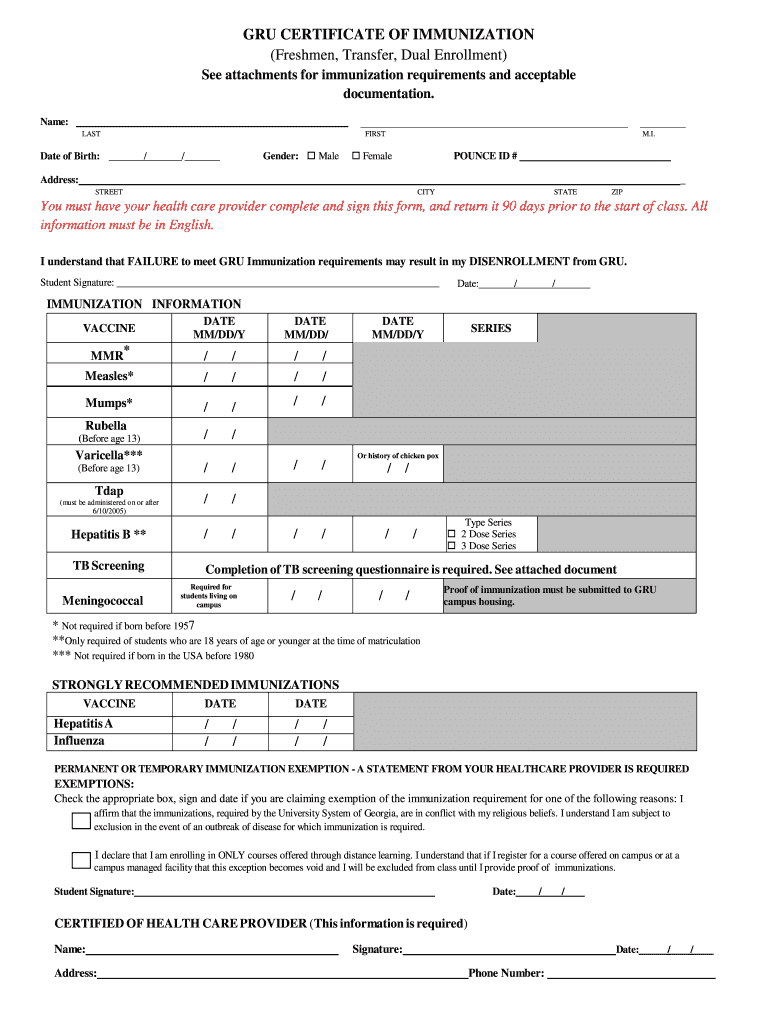 GRU CERTIFICATE OF IMMUNIZATION (Freshmen, Transfer, Dual Enrollment) See attachments for immunization requirements and acceptable documentation. Name: LAST Date of Birth: FIRST / Gender: Male / M.I.