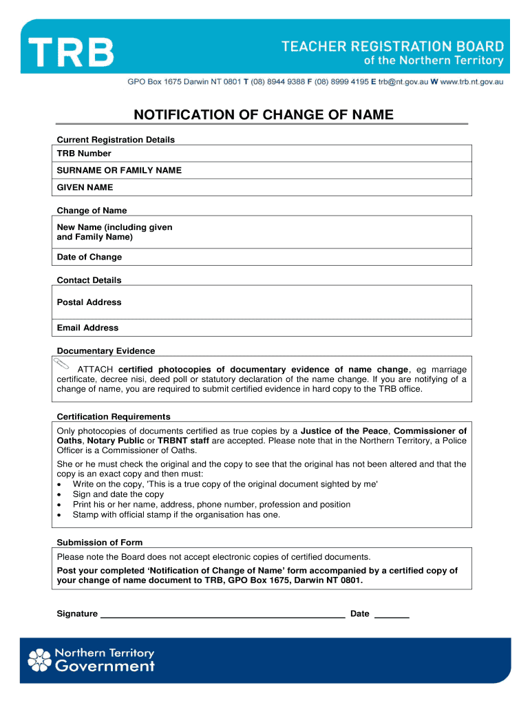 Get the free NOTIFICATION OF CHANGE OF NAME - trbntgovau