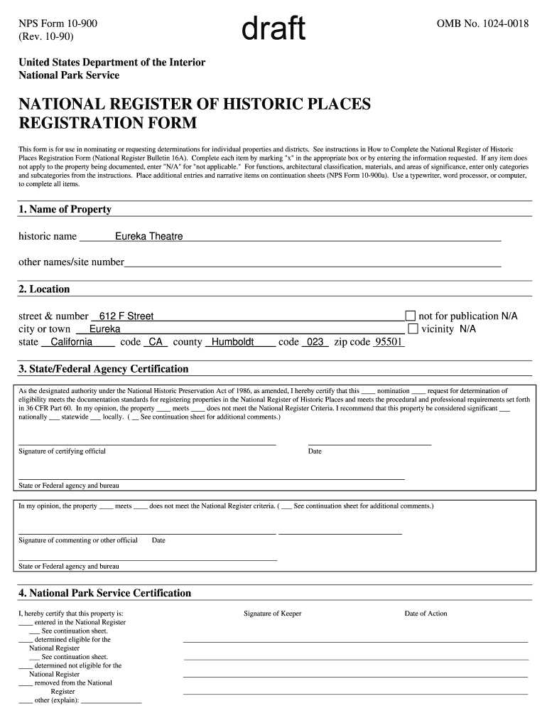Draft NPS Form 10900 (Rev. 1090) OMB No. 10240018 United States Department of the Interior National Park Service NATIONAL REGISTER OF HISTORIC PLACES REGISTRATION FORM This form is for use in nominating