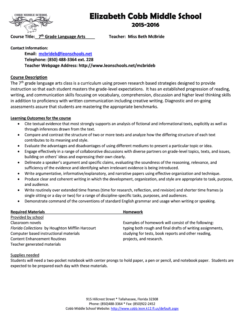 Elizabeth Cobb Middle School 20152016 Course Title: 7th Grade Language Arts Teacher: Miss Beth McBride Contact Information: Email: McBride leonschools.net Telephone: (850) 4883364 ext. 228 Teacher