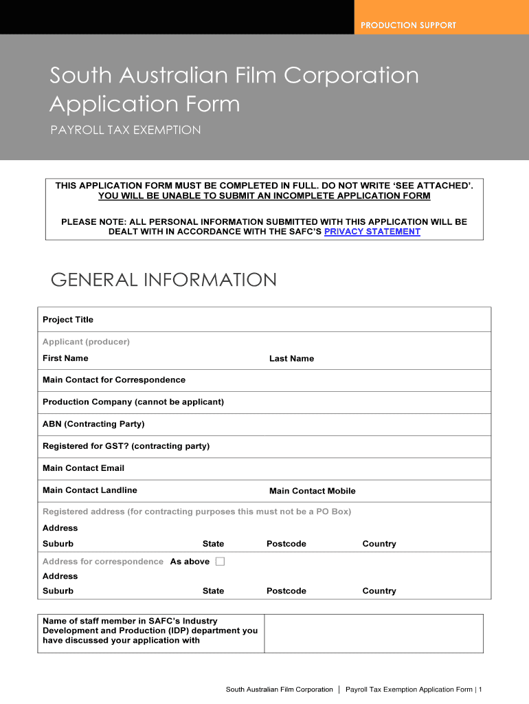 PRODUCTION SUPPORT South Australian Film Corporation Application Form PAYROLL TAX EXEMPTION 1.0 PRODUCTION FINANCE COMPLETED IN FULL. DO NOT WRITE SEE ATTACHED. THIS APPLICATION FORM MUST BE YOU WILL
