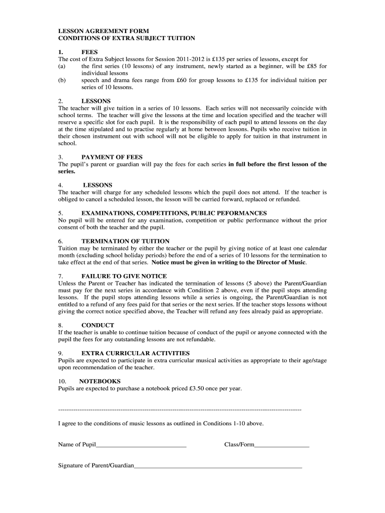 LESSON AGREEMENT FORM CONDITIONS OF EXTRA SUBJECT TUITION 1. FEES The cost of Extra Subject lessons for Session 2011-2012 is 135 per series of lessons, except for (a) the first series (10 lessons)