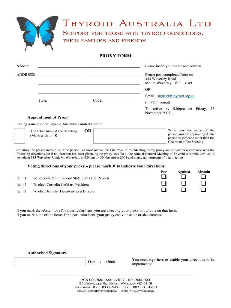 Thyroid Australia Ltd Support for those with thyroid conditions, their families and friends PROXY FORM NAME: ADDRESS: Please insert your name and address Please post completed form to: 333 Waverley