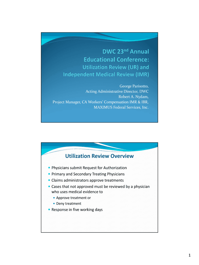 George Pa risotto, Acting Administrative Director, DWC Robert A. Adam, Project Manager, CA Workers Compensation MR & IBR, MAXIMUS Federal Services, Inc. Utilization Review Overview Physicians submit