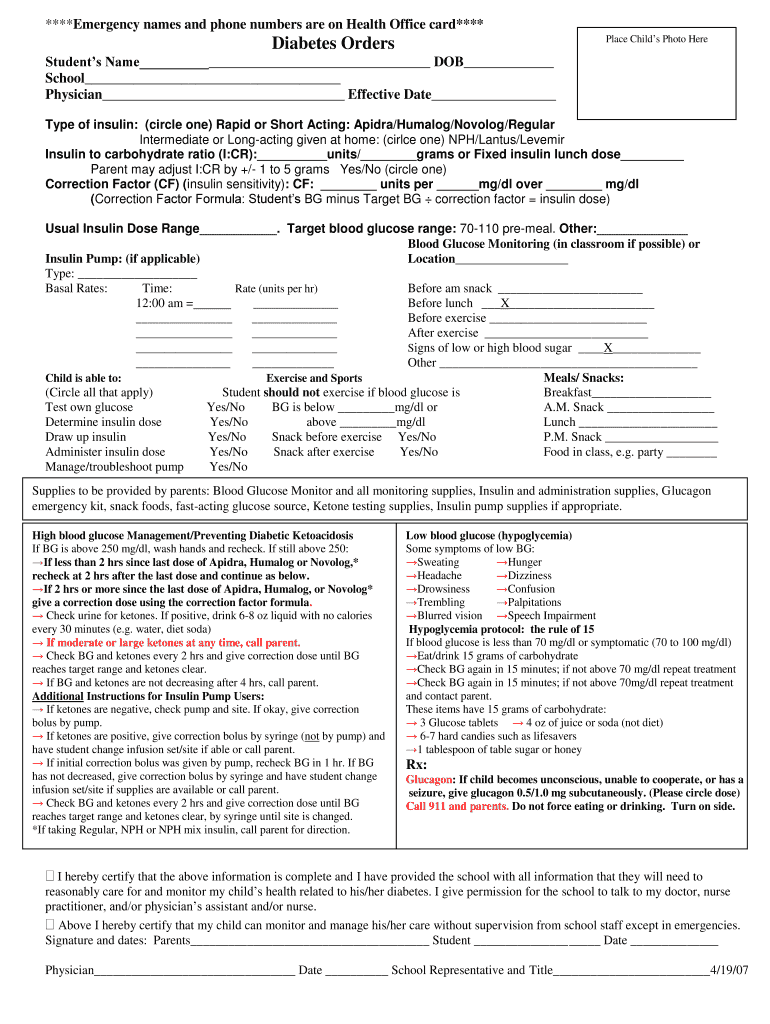 ****Emergency names and phone numbers are on Health Office card**** Place Child's Photo Here Diabetes Orders Students Name DOB School Physician Effective Date Type of insulin: (circle one) Rapid or