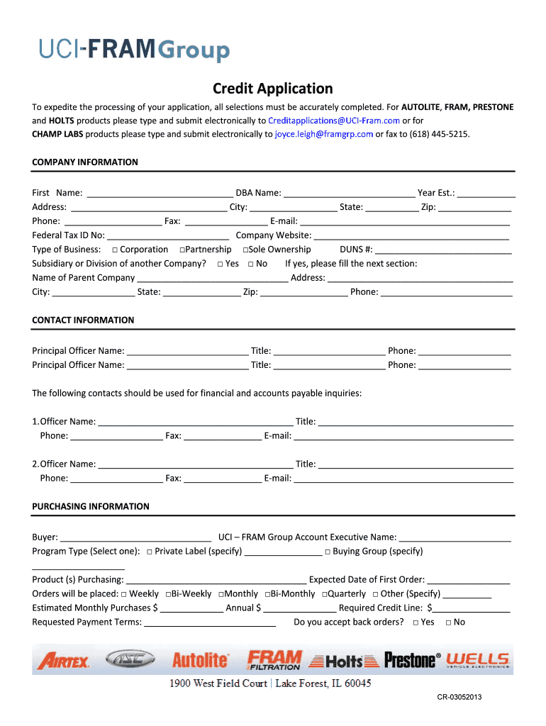 CreditApplication Toexpeditetheprocessingofyourapplication, allselectionsmustbeaccuratelycompleted. ForAUTOLITE, FROM, PRESTON andHOLTSproductspleasetypeandsubmitelectronicallytoCreditapplications