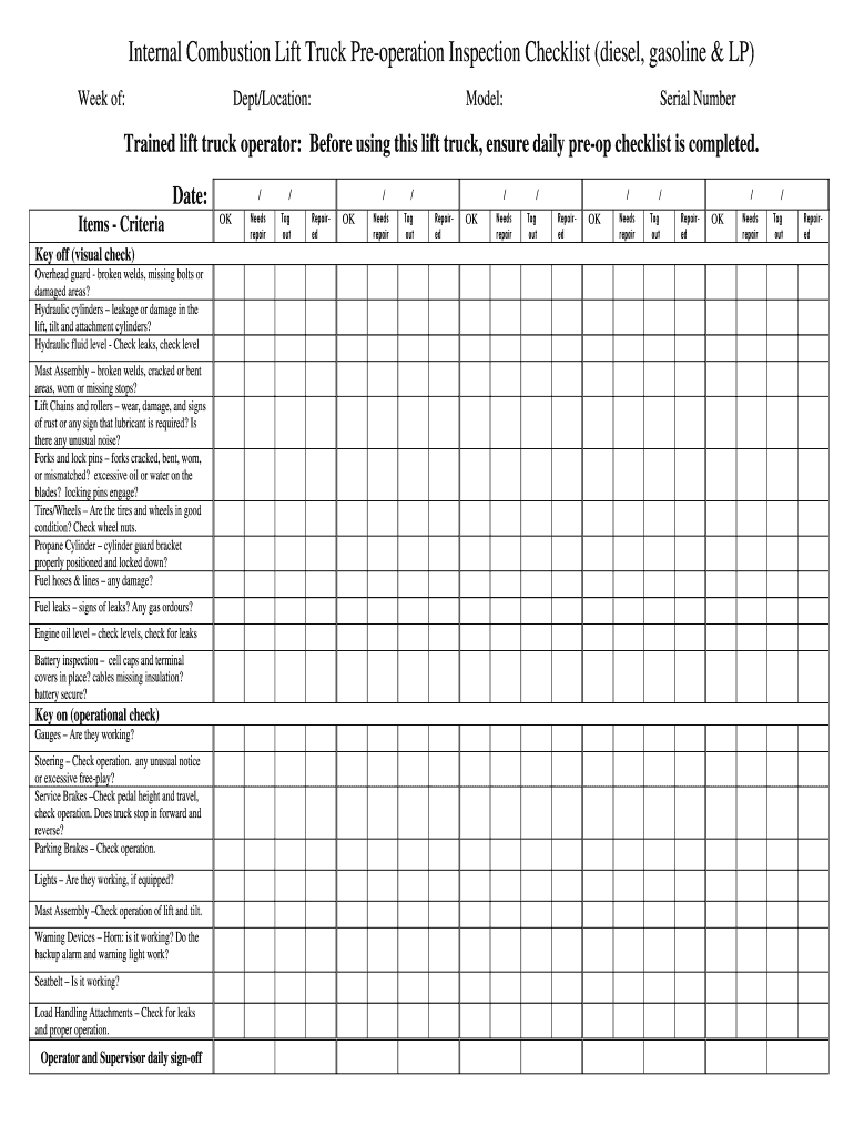 Week of:Dept/Location:Model:Serial NumberTrained lift truck operator: Before using this lift truck, ensure daily