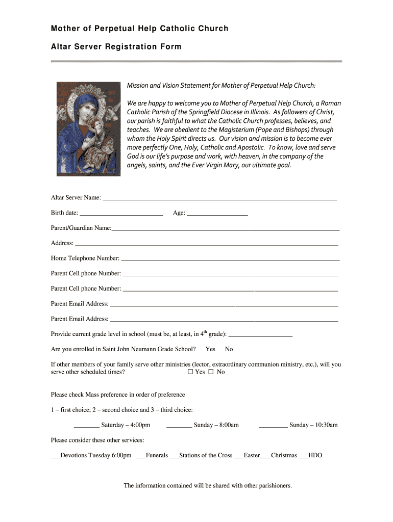 Mother of Perpetual Help Catholic Church Altar Server Registration Form Mission and Vision Statement for Mother of Perpetual Help Church: We are happy to welcome you to Mother of Perpetual Help Church,