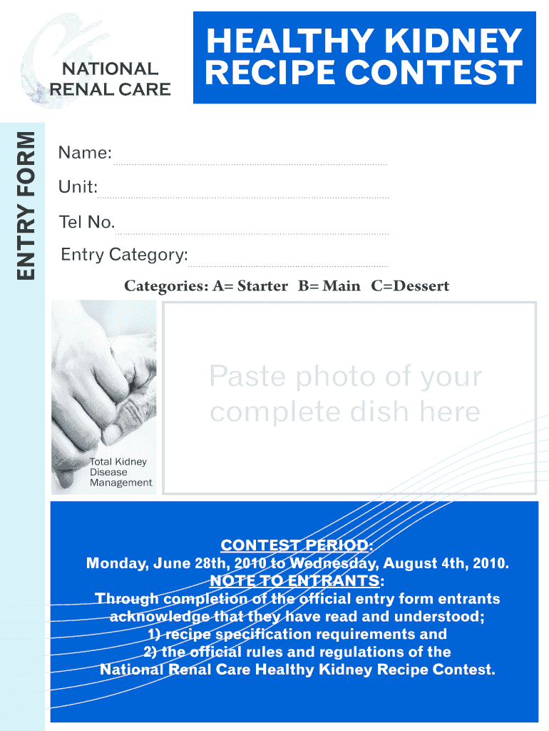 ENTRY FORM HEALTHY KIDNEY RECIPE CONTEST Name: Unit: Tel No. Entry Category: Categories: A Starter B Main Dessert Paste photo of your complete dish here CONTEST PERIOD: Monday, June 28th, 2010 to