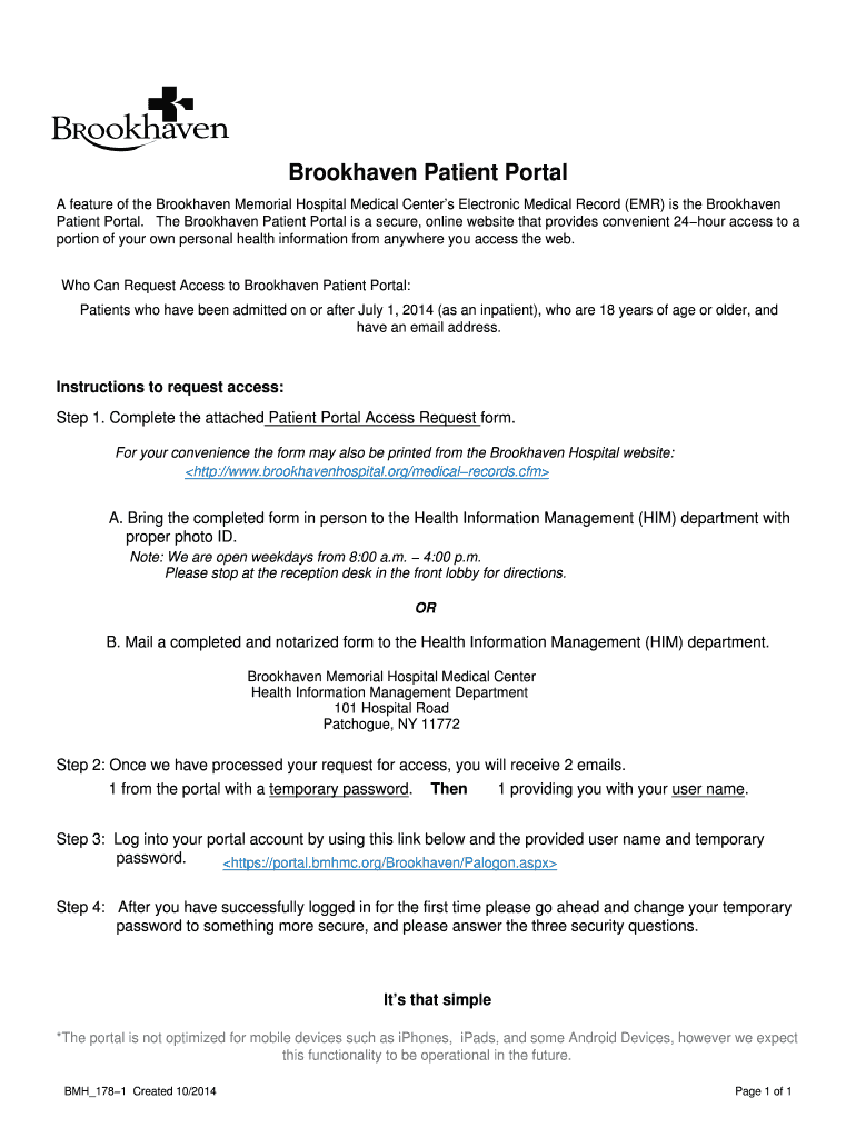 Get the free Brookhaven Patient Portal - brookhavenhospital