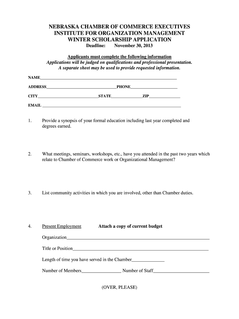 NEBRASKA CHAMBER OF COMMERCE EXECUTIVES INSTITUTE FOR ORGANIZATION MANAGEMENT WINTER SCHOLARSHIP APPLICATION Deadline: November 30, 2013, Applicants must complete the following information Applications