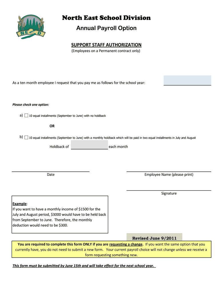 North East School Division Annual Payroll Option SUPPORT STAFF AUTHORIZATION (Employees on a Permanent contract only) As a ten-month employee I request that you pay me as follows for the school year: