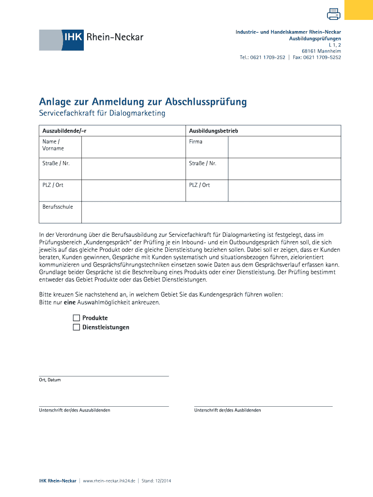 Industries UND Handelskammer RheinNeckar Ausbildungsprfungen L 1, 2 68161 Mannheim Tel.: 0621 1709252 Fax: 0621 17095252 Engage our Amending our Abschlussprfung Servicefachkraft for Dialog marketing