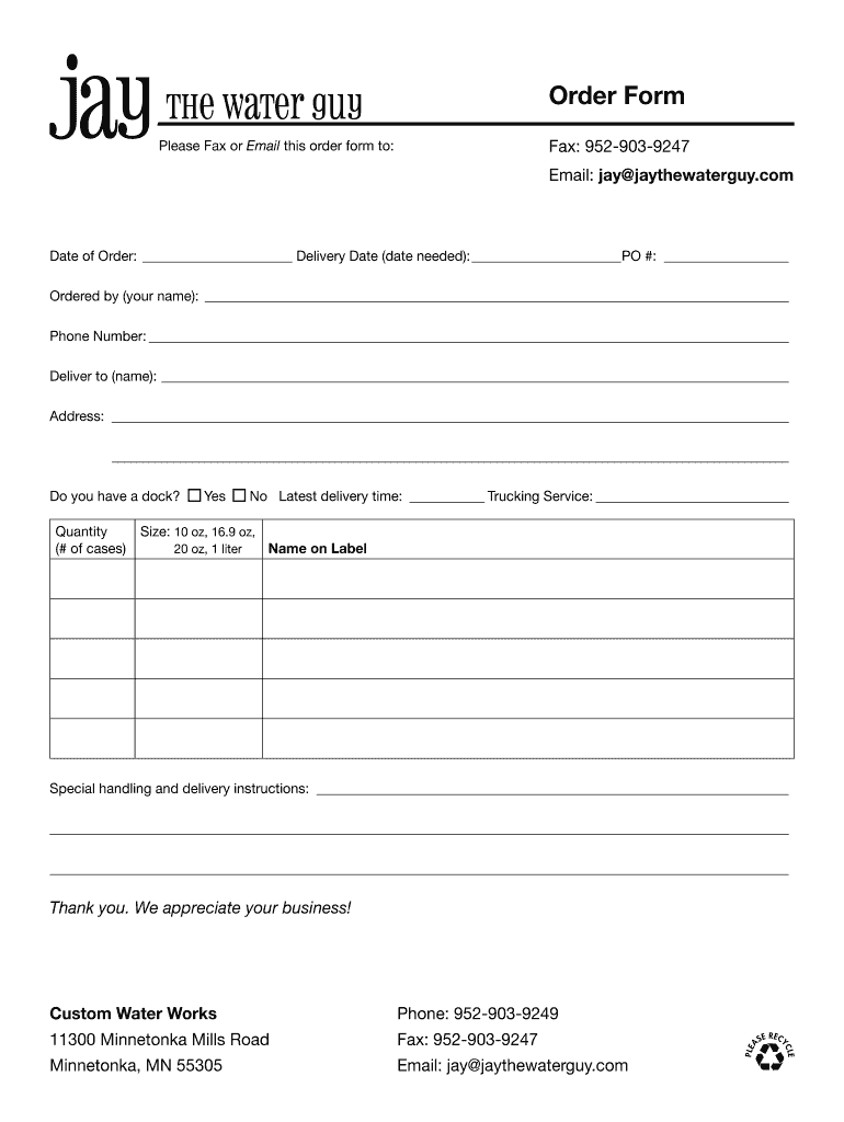 Get the free Jay Order Form the water guy - customwaterworksmncom