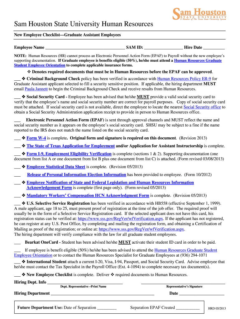 Sam Houston State University Human Resources New Employee ChecklistGraduate Assistant Employees Employee Name SAM ID: Hire Date NOTE: Human Resources (HR) cannot process an Electronic Personnel Action