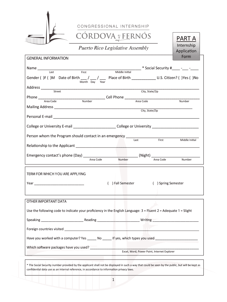 PART A Internship Application Form Puerto Rico Legislative Assembly GENERAL INFORMATION Name * Social Security # Last Middle Initial First Gender ()F ()M Date of Birth / / Place of Birth U.S. Citizen?