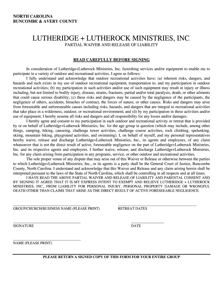 NORTH CAROLINA DUNCOMBE & AVERY COUNTY LETHBRIDGE + LUTHER MINISTRIES, INC. PARTIAL WAIVER AND RELEASE OF LIABILITY READ CAREFULLY BEFORE SIGNING In consideration of Lethbridge+Luther Ministries,