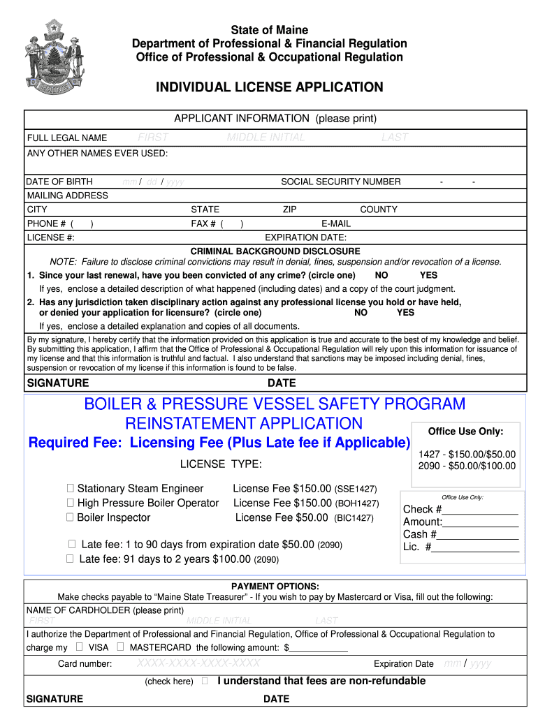 State of Maine Department of Professional & Financial Regulation Office of Professional & Occupational Regulation INDIVIDUAL LICENSE APPLICATION APPLICANT INFORMATION (please print) FIRST FULL LEGAL