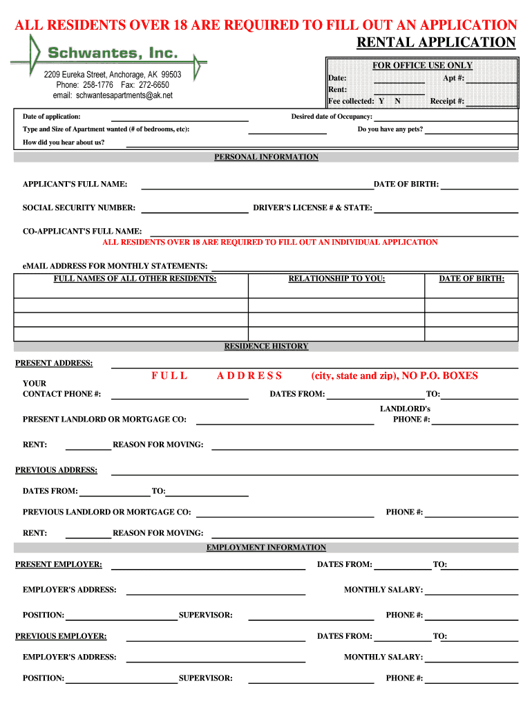 ALL RESIDENTS OVER 18 ARE REQUIRED TO FILL OUT AN APPLICATION RENTAL APPLICATION FOR OFFICE USE ONLY 2209 Eureka Street, Anchorage, AK 99503 Phone: 2581776 Fax: 2726650 email: schwantesapartments