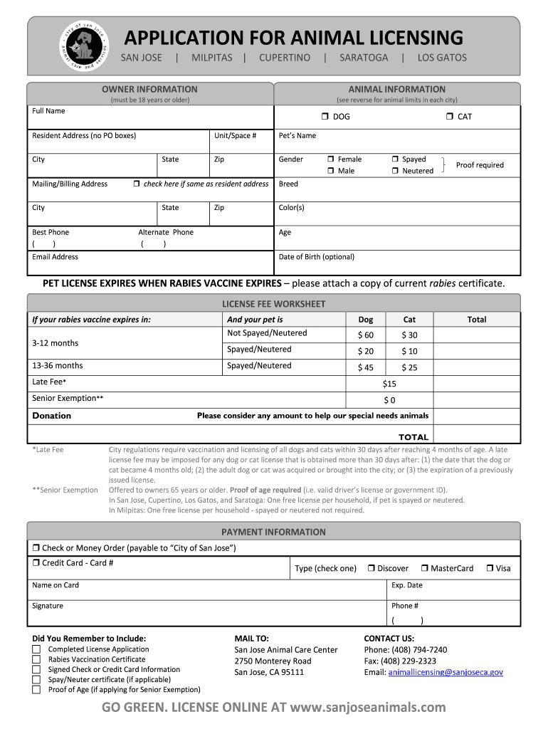 APPLICATION FOR ANIMAL LICENSING APPLICATION SAN JOSE MILPITAS CUPERTINO SARATOGA LOS GATOS OWNER INFORMATION ANIMAL INFORMATION (must be 18 years or older) (see reverse for animal limits in each