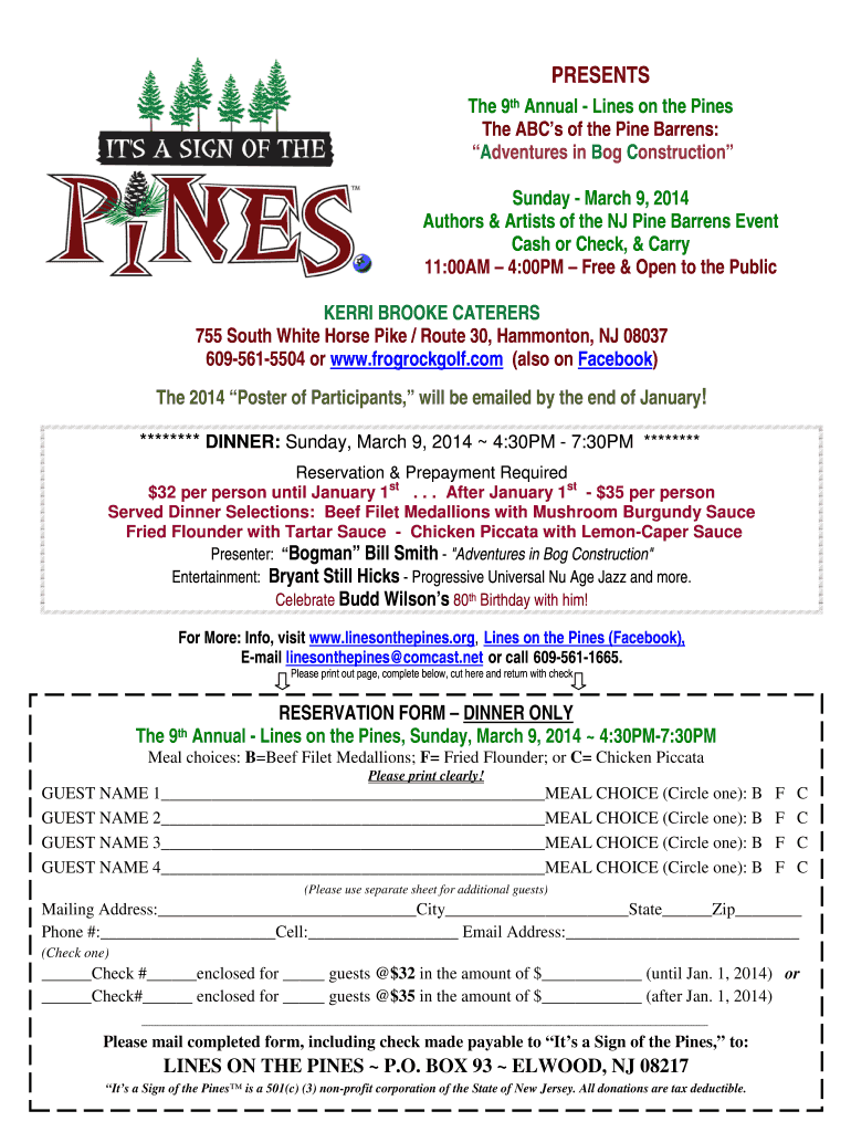 PRESENTS The 9th Annual Lines on the Pines The ABCs of the Pine Barrens: Adventures in Bog Construction Sunday, March 9, 2014, Authors & Artists of the NJ Pine Barrens Event Cash or Check, & Carry