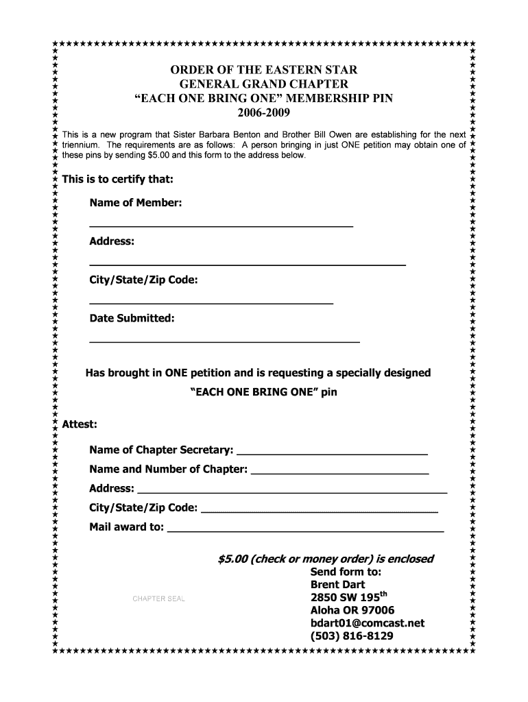 ORDER OF THE EASTERN STAR GENERAL GRAND CHAPTER EACH ONE BRING ONE MEMBERSHIP PIN 20062009 This is a new program that Sister Barbara Benton and Brother Bill Owen are establishing for the next triennial.