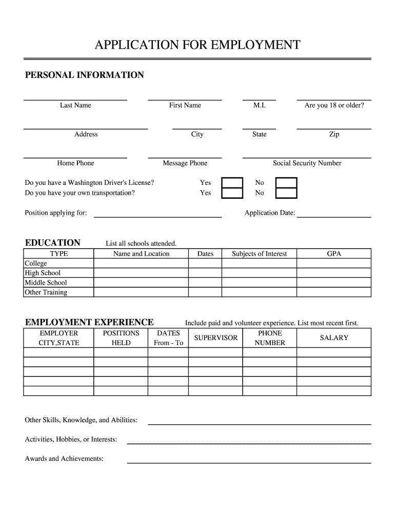 APPLICATION FOR EMPLOYMENT PERSONAL INFORMATION Last Name First Name Address City Home Phone Are you 18 or older? State Zip Message Phone Do you have a Washington Driver's License? Do you have your