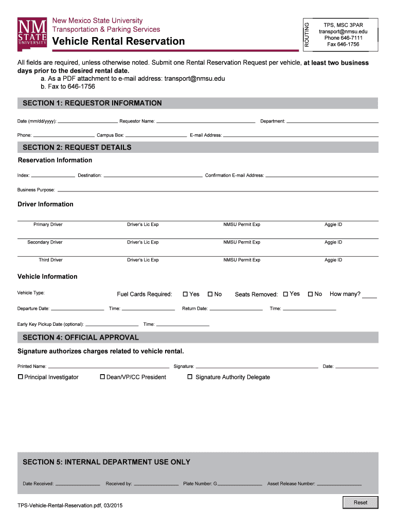 Get the free New Mexico State University TPS MSC 3PAR Vehicle Rental - af nmsu