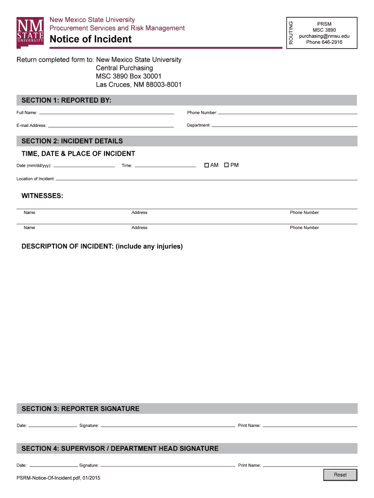 ROUTING New Mexico State University Procurement Services and Risk Management Notice of Incident PRISM MSC 3890 purchasing MSU.edu Phone 6462916 Return completed form to: New Mexico State University
