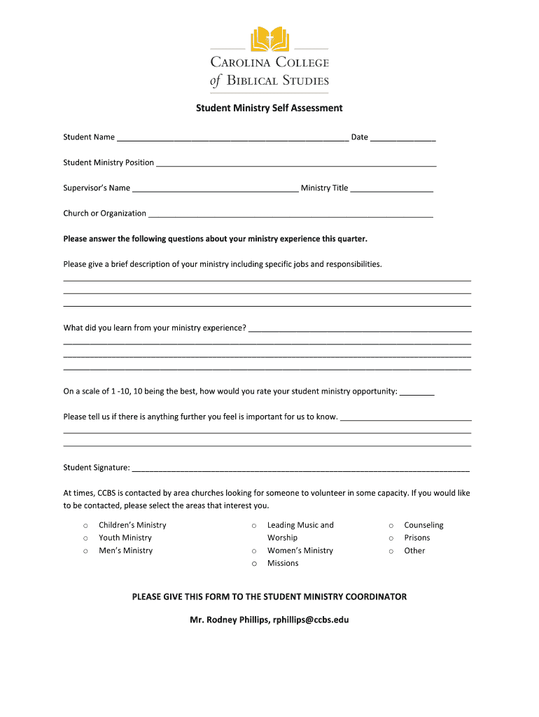 Student Ministry Self Assessment Student Name Date Student Ministry Position Supervisors Name Ministry Title Church or Organization Please answer the following questions about your ministry experience