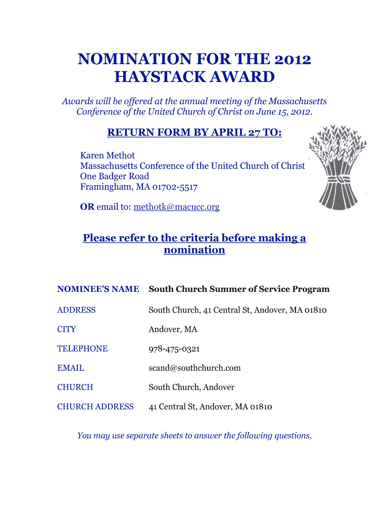 Get the free NOMINATION FOR THE 2012 HAYSTACK AWARD - South Church Andover