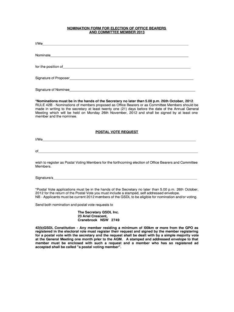 Get the free NOMINATION FORM FOR ELECTION OF OFFICE BEARERS AND COMMITTEE MEMBER 2013 I/We Nomina...