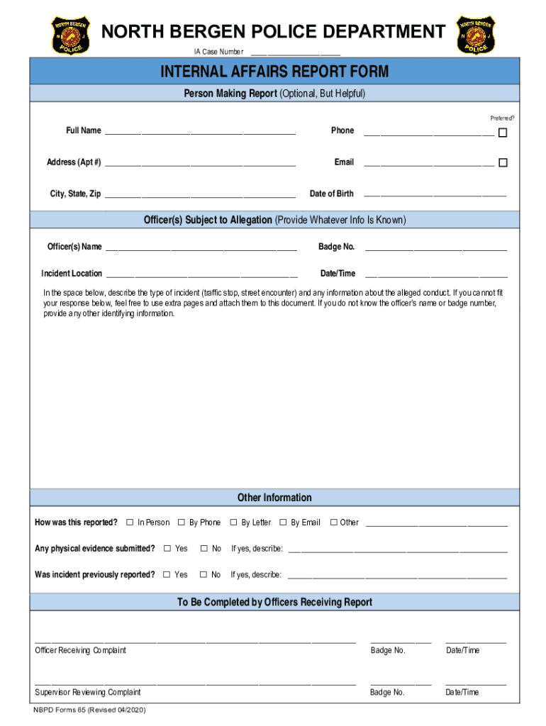 NORTH BERGEN POLICE DEPARTMENT IA Case Number Clear FormINTERNAL AFFAIRS REPORT FORM Person Making Report (Optional, But Helpful) Preferred? Full Name Phone Address (Apt #) Email City, State, Zip