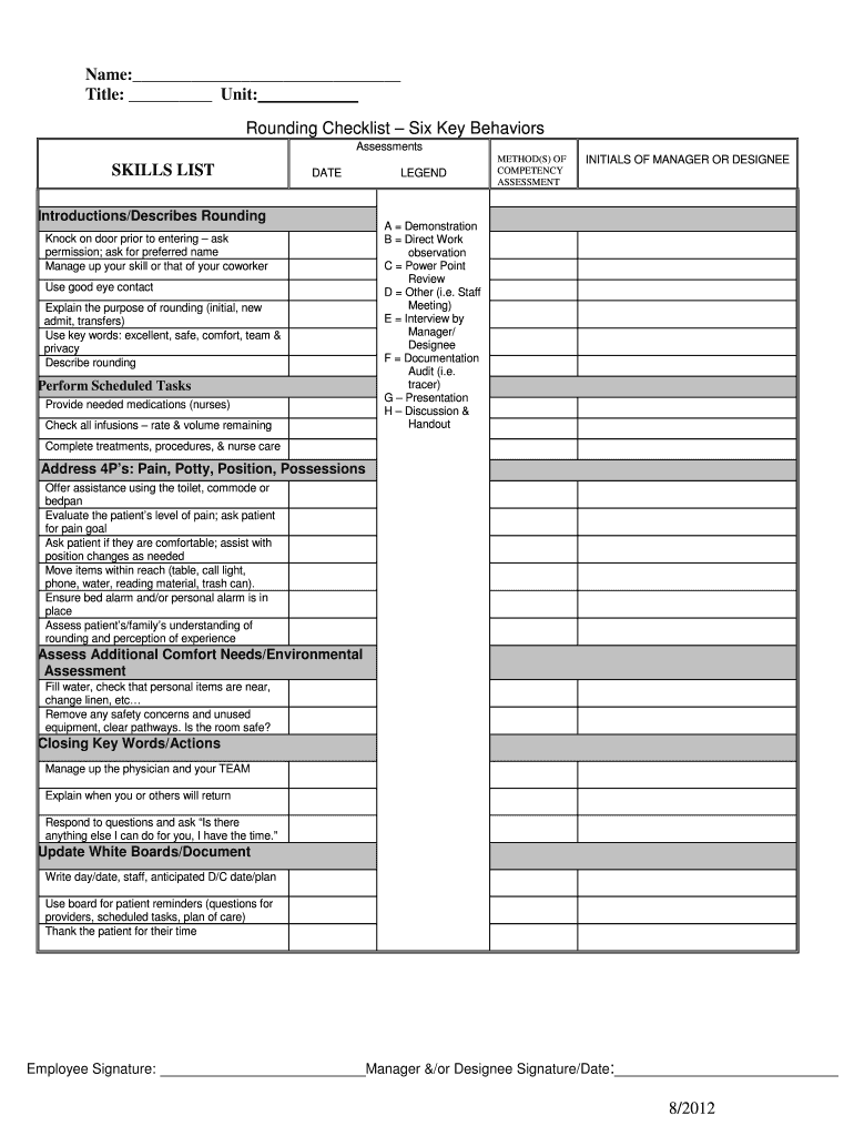 Name: Title: Unit: Rounding Checklist Six Key Behaviors Assessments SKILLS LIST DATE Introductions/Describes Rounding Knock on door prior to entering ask permission; ask for preferred name Manage