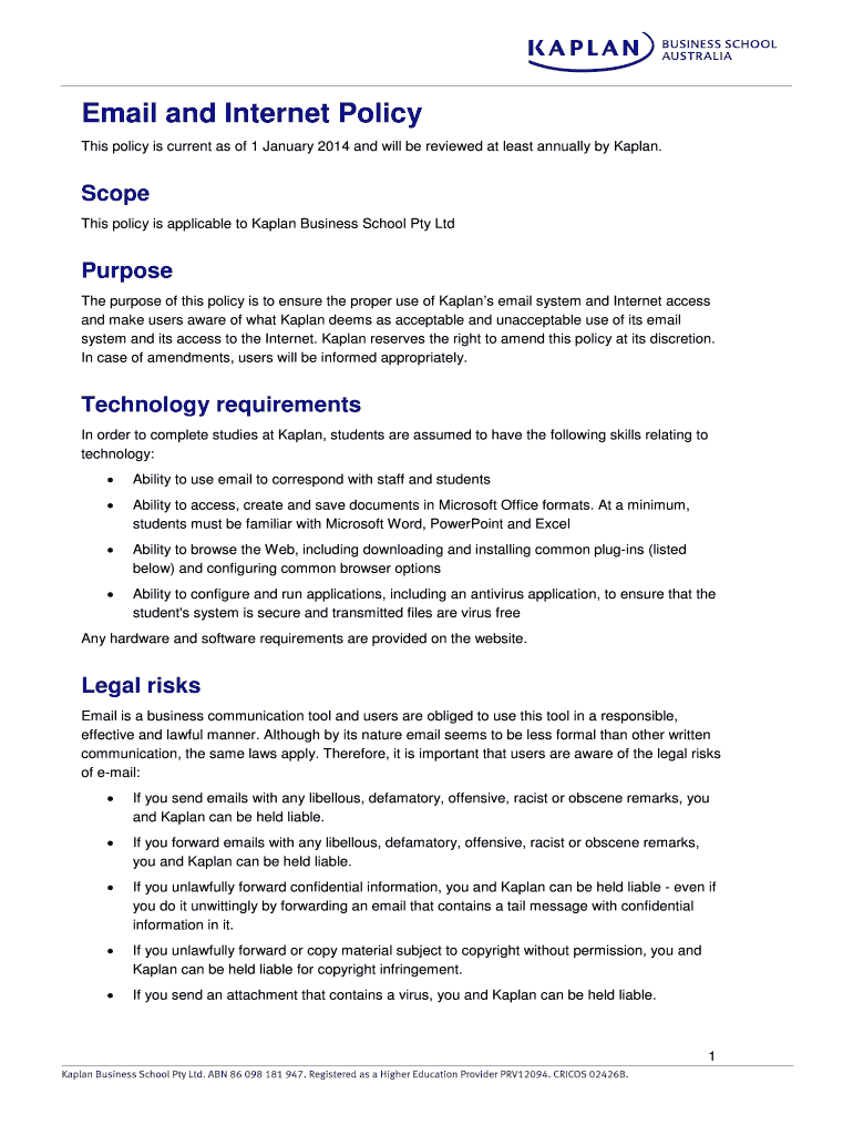 Email and Internet Policy This policy is current as of 1 January 2014 and will be reviewed at least annually by Kaplan. Scope This policy is applicable to Kaplan Business School Pty Ltd Purpose The