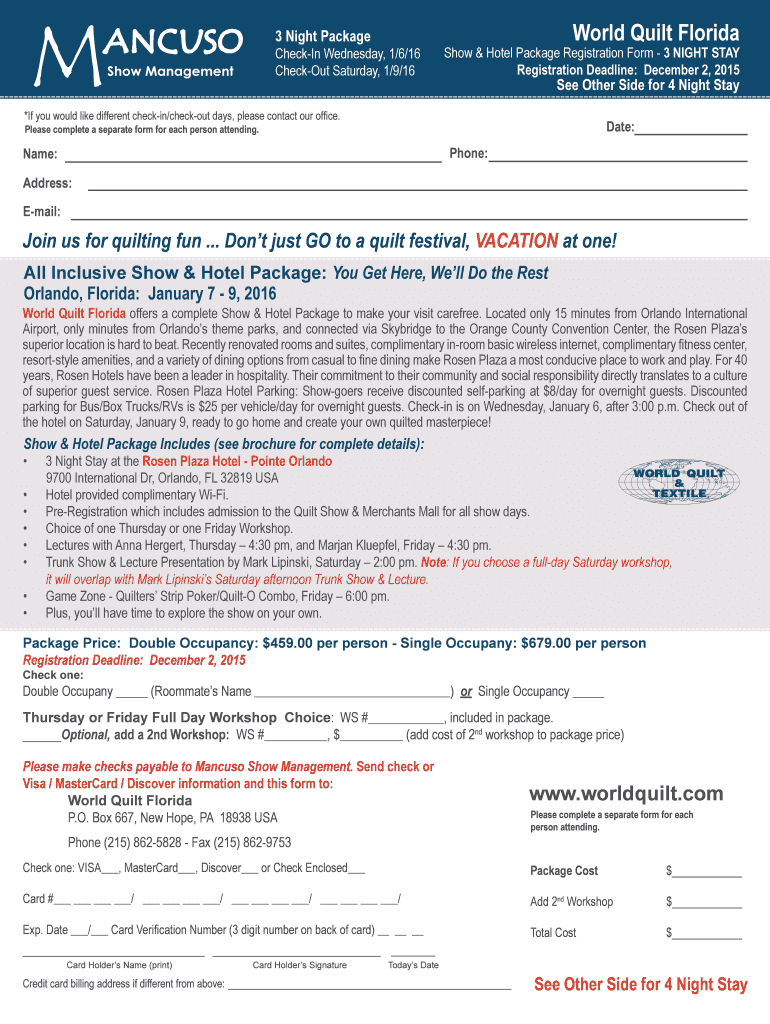 3 Night Package Checking Wednesday, 1/6/16 Checkout Saturday, 1/9/16 World Quilt Florida Show & Hotel Package Registration Form 3 NIGHT STAY Registration Deadline: December 2, 2015, See Other Side