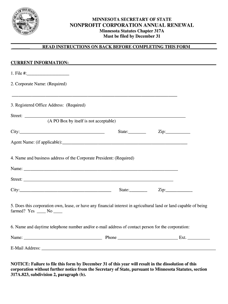MINNESOTA SECRETARY OF STATE NONPROFIT CORPORATION ANNUAL RENEWAL Minnesota Statutes Chapter 317A Must be filed by December 31 READ INSTRUCTIONS ON BACK BEFORE COMPLETING THIS FORM CURRENT INFORMATION: