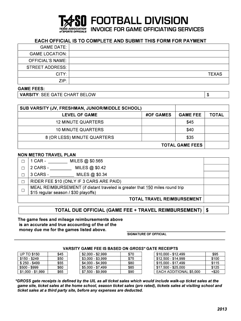 FOOTBALL DIVISION INVOICE FOR GAME OFFICIATING SERVICES EACH OFFICIAL IS TO COMPLETE AND SUBMIT THIS FORM FOR PAYMENT GAME DATE: GAME LOCATION: OFFICIALS NAME: STREET ADDRESS: CITY: TEXAS ZIP: GAME