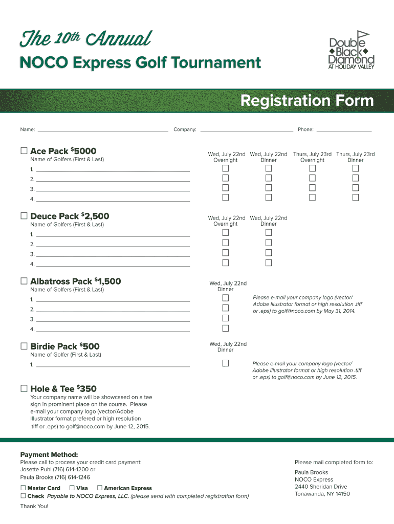 Participants must report their personal information, handicap, and payment details on the Noco Express Golf Tournament registration forms.